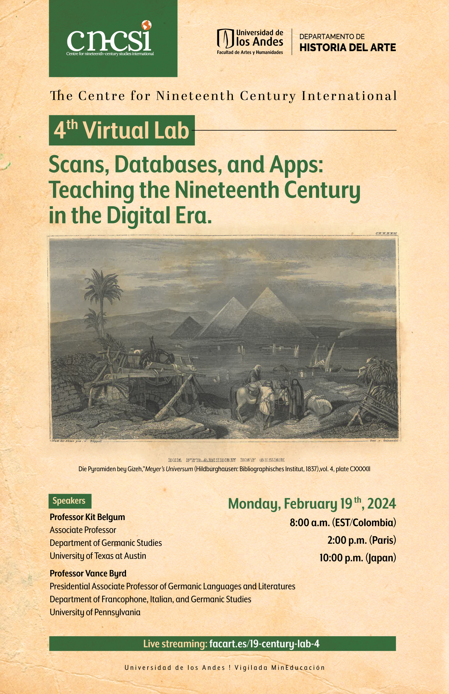 Please join the 4th CNCSI Virtual Lab for a lively discussion with Professor Kit Belgum (University of Texas at Austin) and Professor Vance Byrd (University of Pennsylvania) on “Scans, Databases, and Apps: Teaching the Nineteenth Century in the Digital Era.” Belgum’s and Byrd’s talks will begin Monday, February 19th at 8 AM (EST/Colombia); 2 PM (Paris); 10 PM (Tokyo).